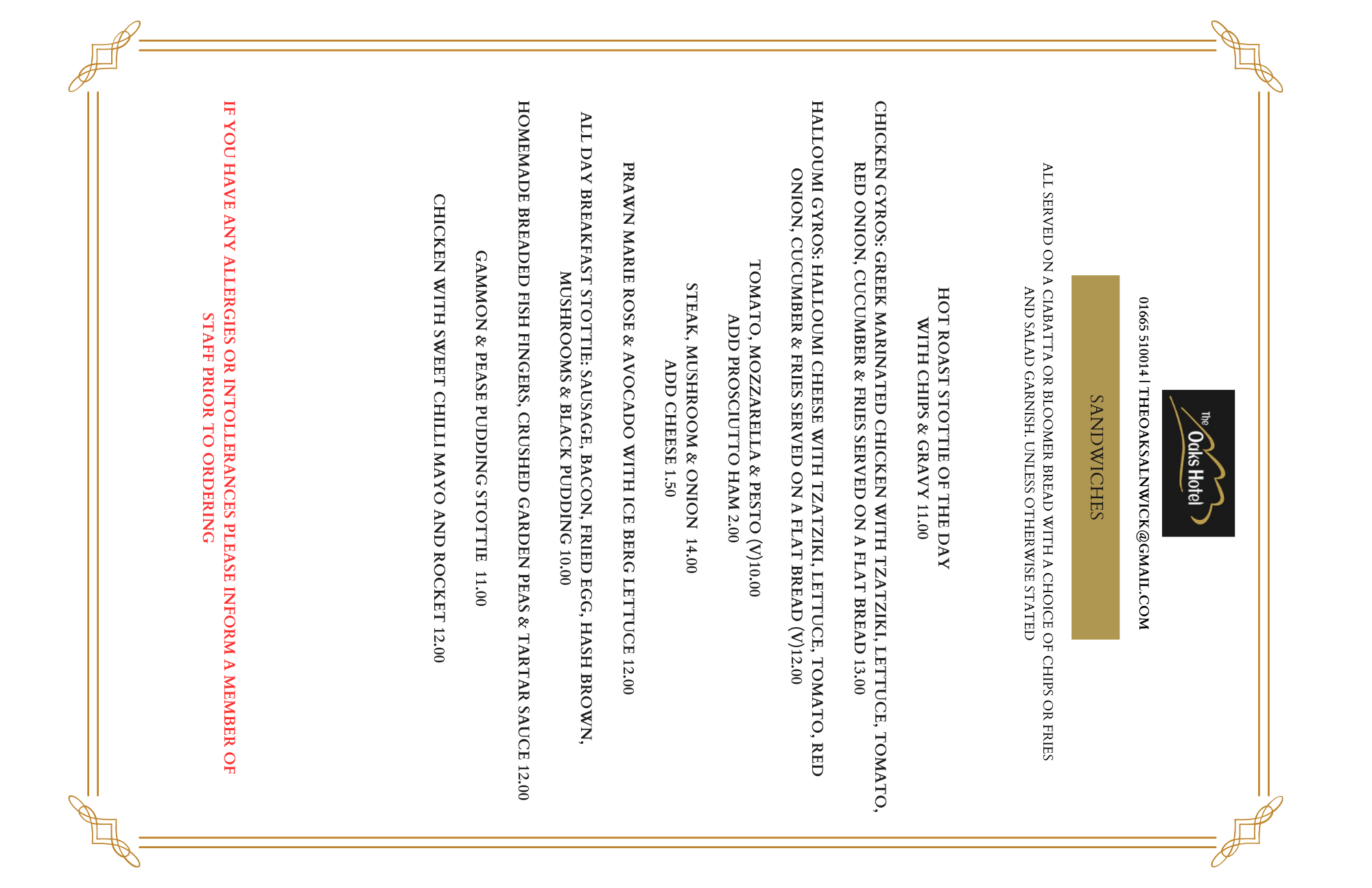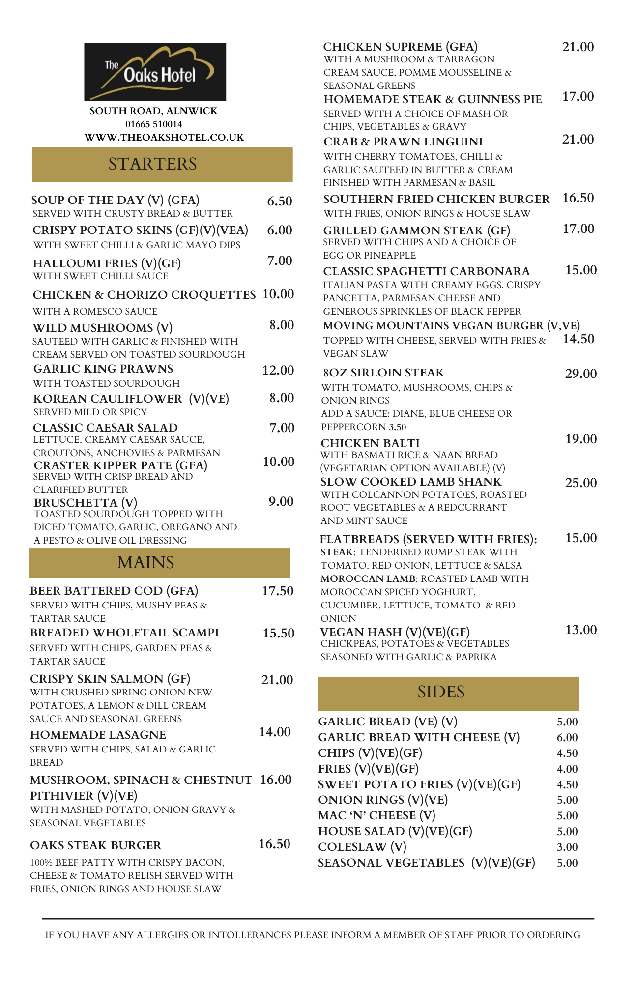 We strongly recommend making a reservation on 01665 510014 should you wish to join us for Sunday Lunch as spaces fill up fast, for any enquiries regarding our menu or reservations you can get in touch at: info@theoakshotel.co.uk